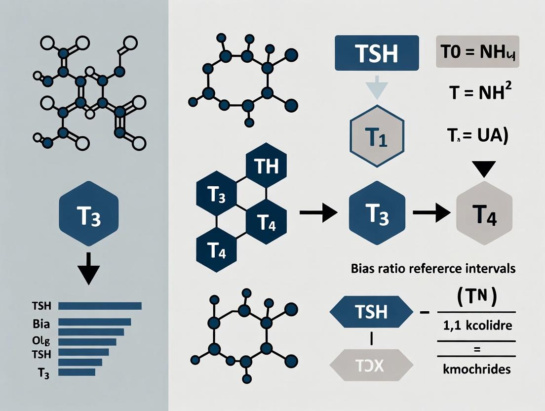 Within the context of establishing and harmonizing thyroid hormone reference intervals (RIs), the bias ratio (BR) is a fundamental statistical metric. It quantifies the systematic difference between measurement methods. For thyroid-stimulating hormone (TSH), free thyroxine (FT4), and free triiodothyronine (FT3) assays, even small biases can significantly impact clinical interpretation. This guide defines the bias ratio and compares its application using data from recent method comparison studies, framed within a thesis on RI assessment.